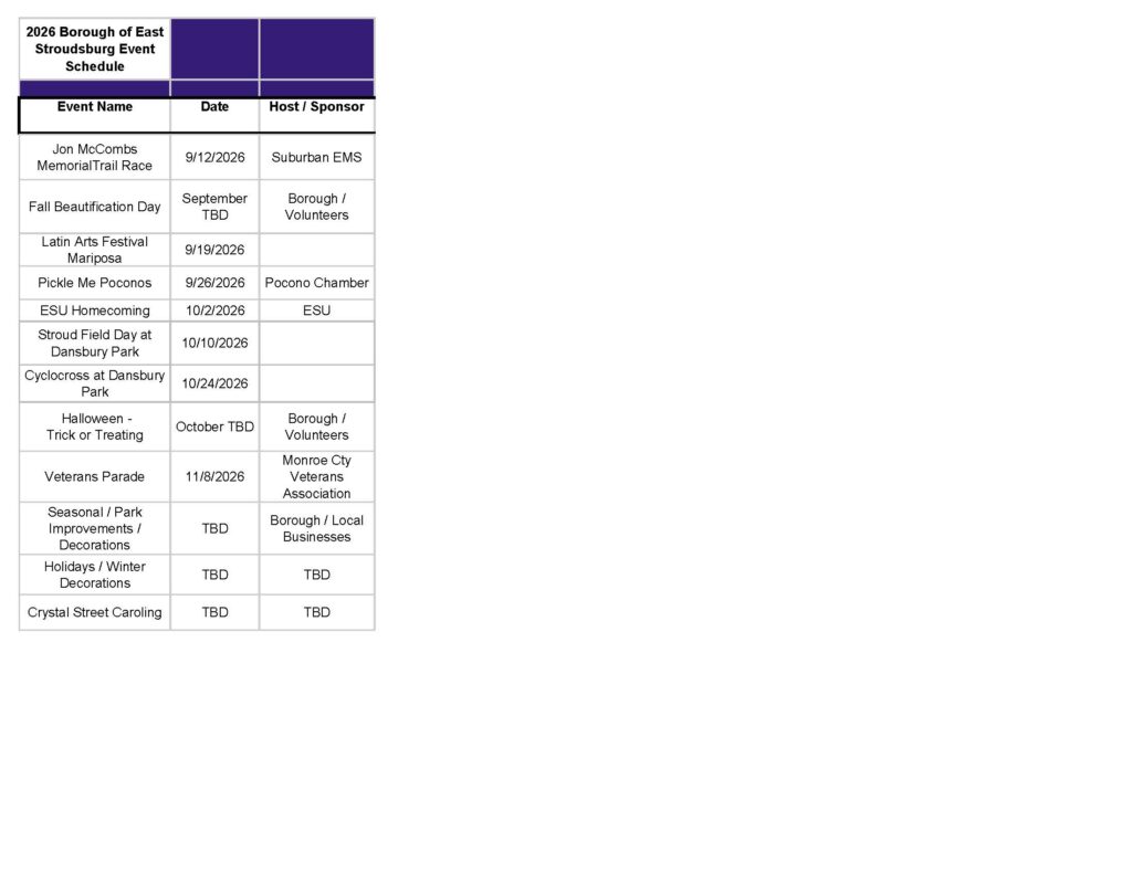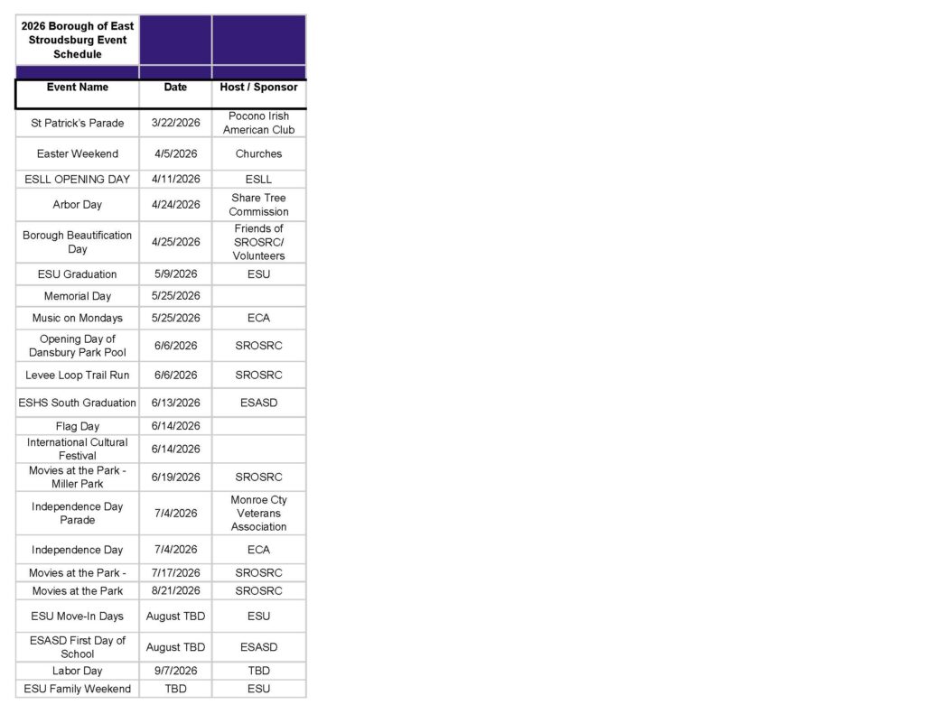 2026 East Stroudsburg Borough Event Schedule